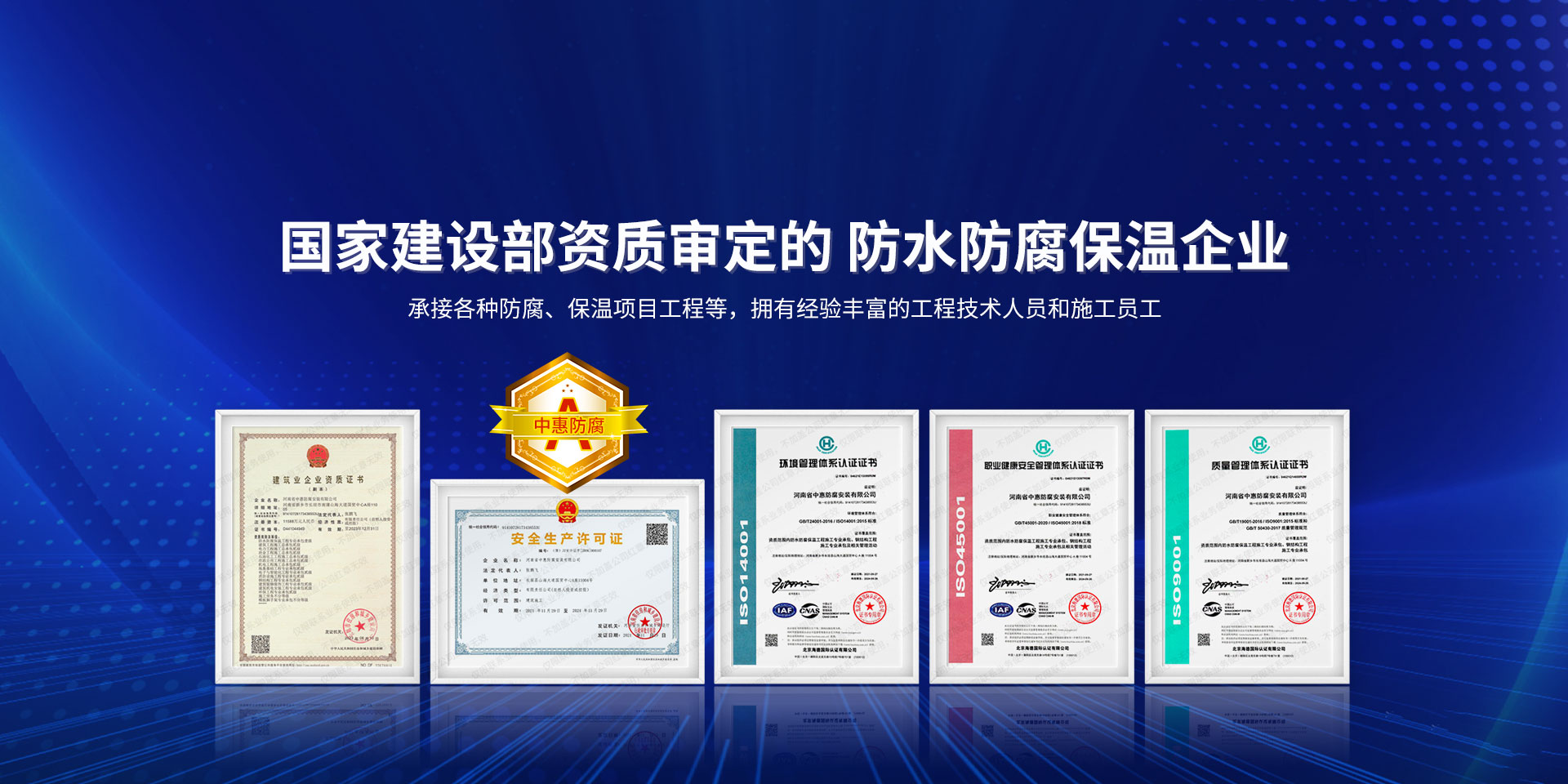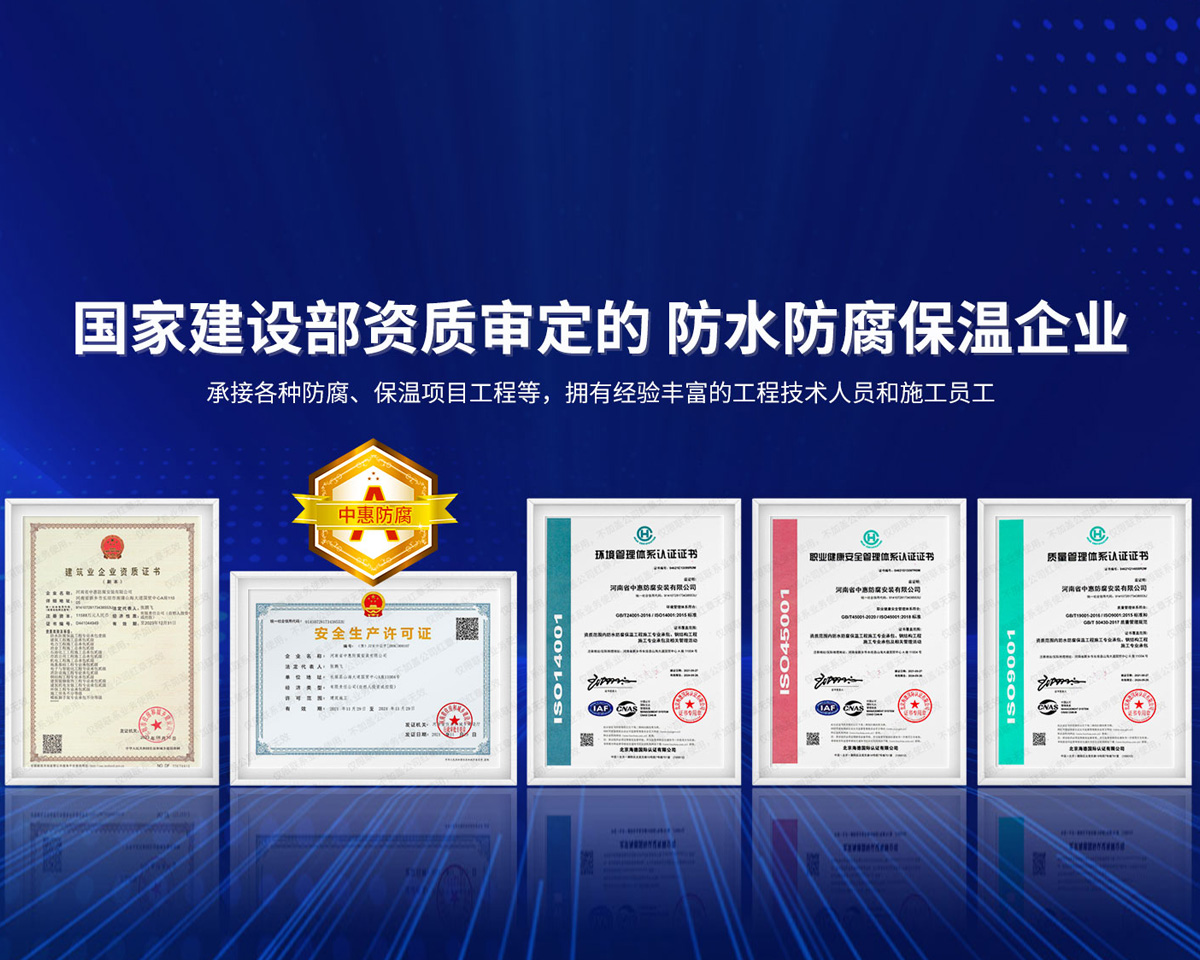 公司經營范圍:防水防腐保溫工程;消防設施工程;建筑裝修裝飾工程;建筑機電安裝工程;電力工程;建筑工程;石油化工工程;工業清洗工程;油罐清洗工程;鋼結構工程;環保工程;模板腳手架工程;電纜防火封堵、防污閃噴涂、外墻外保溫工程;各類施工勞務作業;設備維修、船舶鉚焊、涂裝;電力工程材料、建材、防水材料、防火材料、防腐保溫材料銷售,并相繼通過了GB/T19001-2008idtISO9001:2008GB/T50430-2007質量管理體系認證證書。GB/T24001-2004idtISO14001:2004環境管理體系認證證書。GB/T28001-2011idtOHSAS18001:2007職業健康安全管理體系認證證書。公司是中國防腐蝕于防護協會、中國施工企業管理協會、電力協會和中國鋼結構防水協會會員單位。 公司的經營業務涵蓋了石油、化工、電力、冶金、煤炭、船舶、國防、燃氣、水利、環保、交通運輸、航空及國防軍工和輕紡市政等行業的防腐保溫絕熱設備。鋼結構安裝、防火、防水、金屬噴鍍、聚脲噴繪、陰極保護、防滲透堵漏、玻璃鋼及各種磚版材料襯里、橡膠襯里、煙氣硫和耐酸溶劑腐蝕等工程施工。公司連續十年榮獲“省市先進施工企業”“安全生產先進單位”“重合同,守信用企業”和“AA***資質企業”的稱號。2000年被命名為市級文明單位,2002年被國家工商行政管理局命名為“重合同,守信用的企業”、被中國工業防腐蝕技術協會命名為“防腐蝕企業,能源節約及環境保護領域有豐富的經驗和***的業績。工程一次交驗合格率100%。其中攀枝花鋼鐵公司煉鐵廠四號高爐及熱風爐防腐工程、上海寶鋼公司煤氣柜防腐工程、撫順石油一廠裝置防腐項目、齊魯石化公司稀烴廠高塔防腐工程、吉林化學工業公司煉油廠油罐防腐工程、天津石化熱電廠六號爐頂棚聯絡管保溫工程、大慶油田(太倉)力神泵業工程、中國化學工程第十一建設工程、中原油田勘探局工程、中國石化銷售有限公司華北分部、魯皖輸油管道工程、貴州開磷息烽合成氨工程、陜西黃陵煤化工程、中國石油天然氣西部管道塔里木輸油工程、邯鋼集團邯寶鋼鐵公司煉鐵工程、德州供電工程、吉寶(南通)船廠工程,偃師華潤熱力工程、鄭州熱力總公司。 河南省中惠防腐安裝有限公司愿以豐富的施工經驗,***的技術,***的設備,***的管理,***的服務,竭誠為國內外廣大的用戶提供***滿意、******的工程作品?! ∥夜驹概c國內外同仁一道,團結協作,共同推進防腐蝕行業發展! 公司地址:河南省長垣縣建設路北段360號 固定電話:0373-8866488 郵編:453400 網址:http://www_hbzhentian_com.xyfck16.com